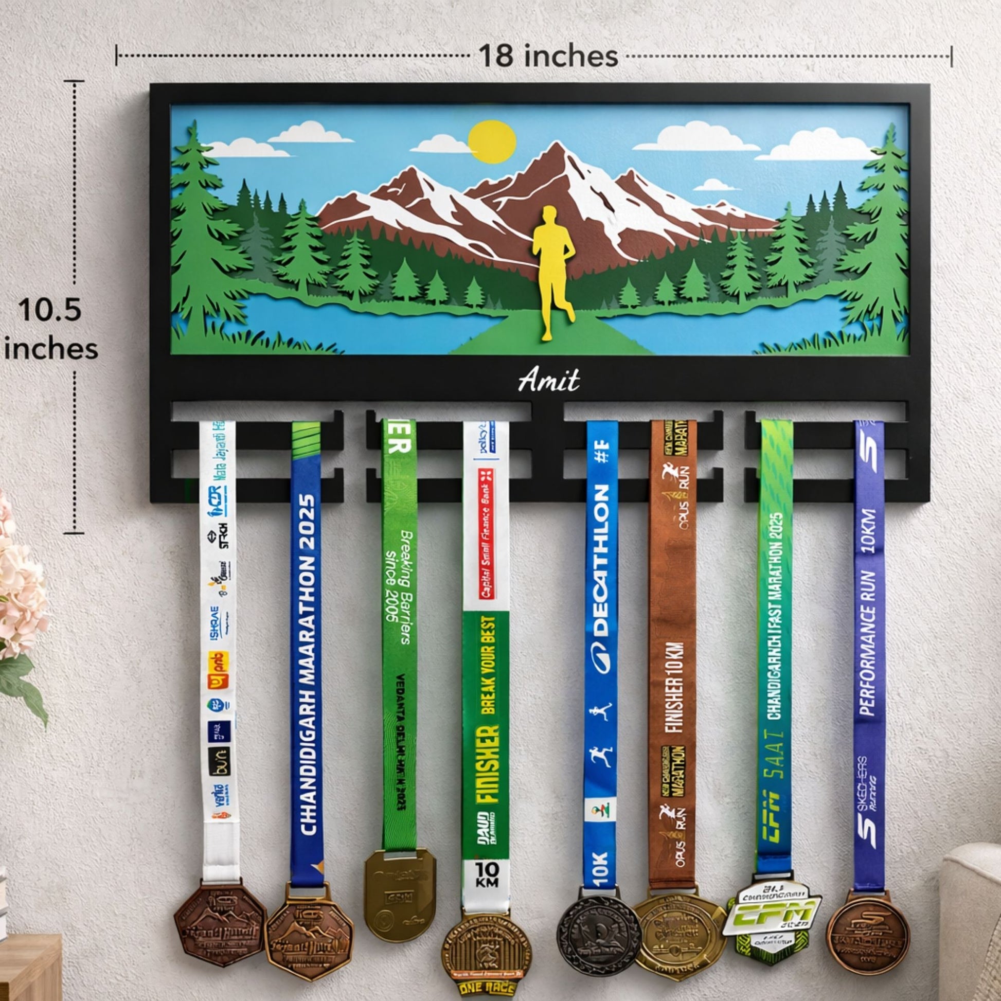 ✔ More than just a medal holder – Most medal hangers are simple metal racks that look similar and often blend into the background. This design turns your medals into a visual story, combining running inspiration with wall décor that actually stands out.